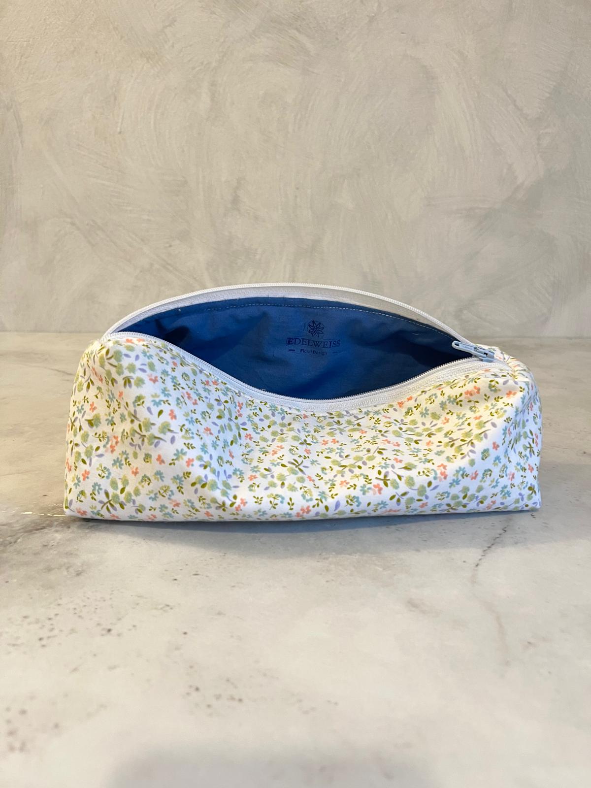 l neceser Jazmín de Edelweiss Floral es una oda a la calma y la belleza natural. Su estampado floral en tonos verdes, naranjas y azulones sobre fondo blanco recuerda a un jardín primaveral bañado por la luz del sol. El interior azul intenso añade un toque sorprendente de color, mientras su cierre verde claro aporta equilibrio y armonía al conjunto.