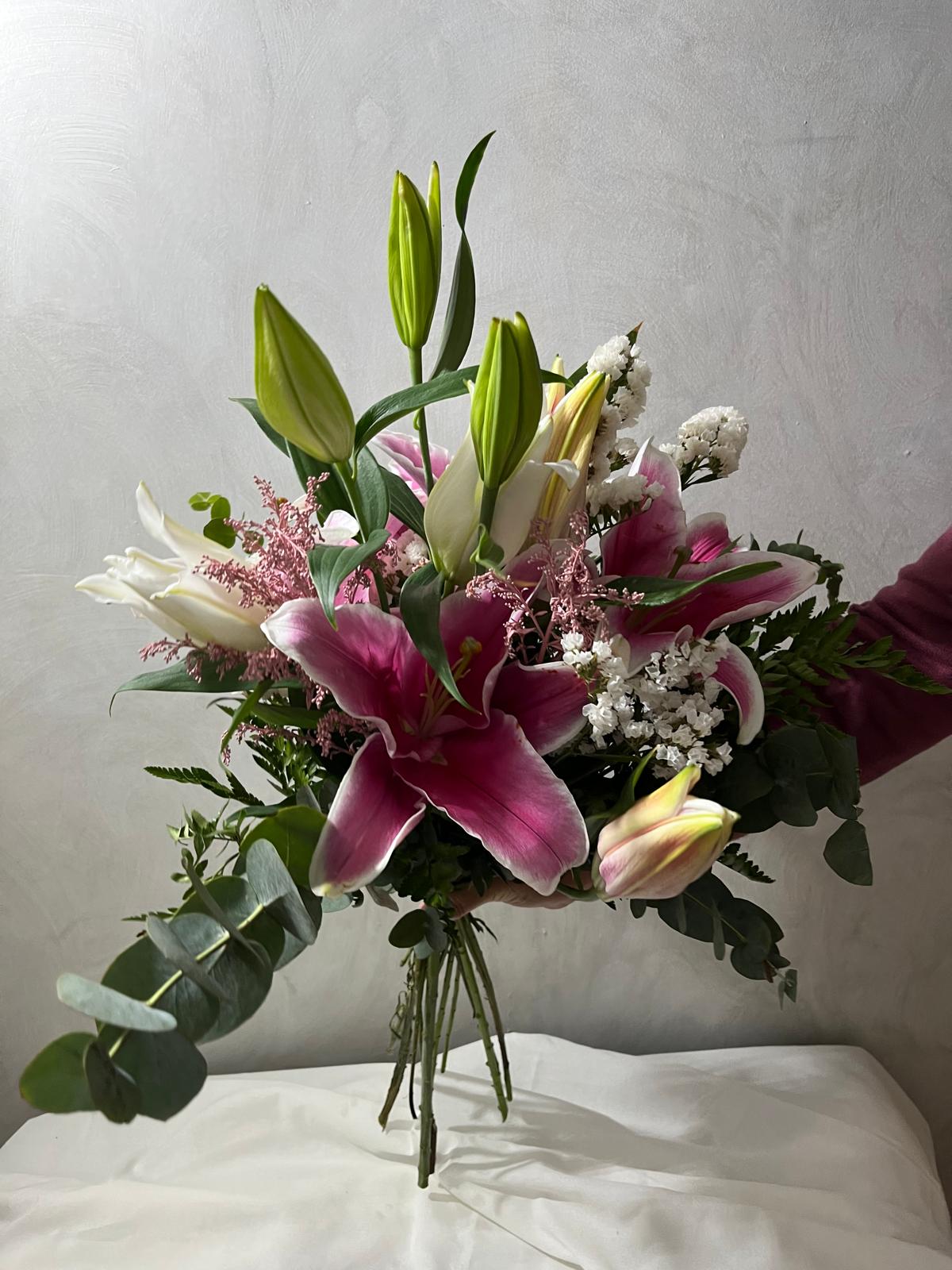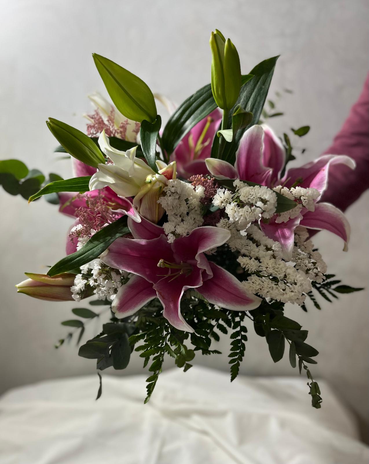 Cada lirio es seleccionado por su frescura y belleza, garantizando una apertura progresiva que permite disfrutar de su esplendor durante más tiempo. El ramo incluye verdes decorativos y flores complementarias que realzan el protagonismo de los lirios, aportando equilibrio y volumen a la composición.